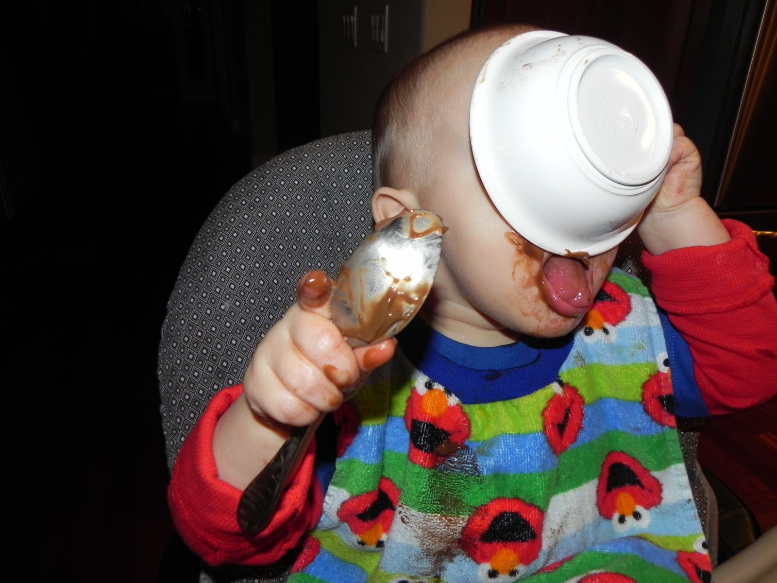 Determined to get every last drop! Daddy was generous to share his chocolate pudding with Little Man.